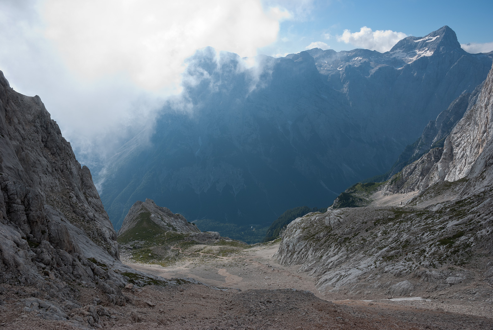 | La valle Krnica e il Prisojnik nascosto dalle nubi |