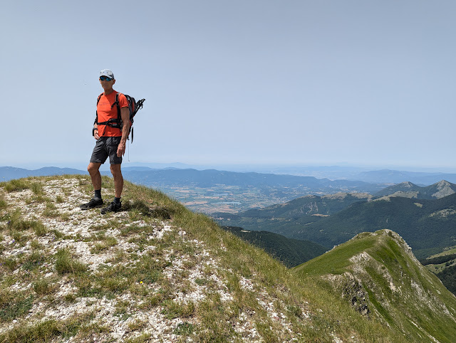 Facciamo una breve sosta al rifugio Rinaldi, posto proprio in vetta al Terminilletto (2104 m). Dopop aver mangiato e soprattutto bevuto in abbondanza, riprendiamo il cammino sull'ampio sentiero che porta a Pian de' Valli. A quota 1950 m circa, però, proprio dove il sentiero lascia il bordo del versante che si affaccia sulla valle dell'Inferno, lasciamo il classico sentiero, per immetterci sul nuovo sentiero Marinelli, aperto anche questo da poco, nell'autunno del 2023.